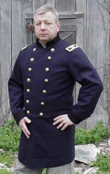 Union Junior officers single breasted frock coat. Regulations specified that junior officers would wear single breasted frock coats. For the most part the Union Junior officers complied with this regulation, Although I can show you a few exceptions. Our single breasted frock is made from 100% federal blue wool, it has a 9 button front with 2 buttons on each cuff and 3 on the each side in the rear. One inner pocket over left breast and one hidden in the tail. Lined with black polished cotton or checked cotton as per many of the originals. It comes lined to the waist or can be fully lined for a small fee. Remember, officers had there own coats made by tailors so you can custom order your coat to be as plain as you like or add your own custom touch. FOR A FULLY LINED FROCK ADD $40.00 CHOOSE NOW! BLACK WOOL COLLAR AND CUFF TRIM FOR YOUR JACKET (AS IN THE PHOTO ABOVE) ADD $30.00 BUY NOW! CHOOSE YOUR SIZE FROM THE CHOICES BELOW IF YOU HAVE SPECIAL FITTING NEEDS (XX LONG ETC.) YOU MUST USE THE SIZE CHART TO INDICATE YOUR EXACT SIZE. THERE IS SOMETIMES BUT NOT ALWAYS AN EXTRA FEE FOR SPECIAL FITTING. Click here for ****SIZE CHART**** SIZE 40 SINGLE BREASTED UNION FROCK #87 $189.95 BUY NOW! SIZE 42 SINGLE BREASTED UNION FROCK #87 $189.95 BUY NOW! SIZE 44 SINGLE BREASTED UNION FROCK #87 $189.95 BUY NOW! SIZE 46 SINGLE BREASTED UNION FROCK #87 $199.95 BUY NOW! SIZE 48 SINGLE BREASTED UNION FROCK #87 $199.95 BUY NOW! SIZE 50 SINGLE BREASTED UNION FROCK #87 $209.95 BUY NOW! SIZE 52 SINGLE BREASTED UNION FROCK #87 $209.95 BUY NOW! SIZE 54 SINGLE BREASTED UNION FROCK #87 $219.95 BUY NOW! SIZE 56 SINGLE BREASTED UNION FROCK #87 $219.95 BUY NOW! SIZE 58 SINGLE BREASTED UNION FROCK #87 $249.95 BUY NOW! SIZE 60 SINGLE BREASTED UNION FROCK #87 $249.95 BUY NOW!