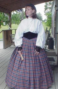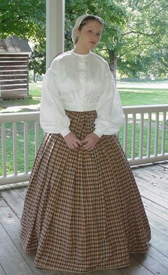 These skirts are not as full as the "fashionable" skirts of the 1860's. They are smaller in circumference , reminiscent of the fashions of the late 1840's. This allows you to "get around" a campfire or a loom/wash-kettle/stove, etc. a little easier and safer.