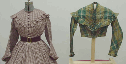 Any way ---- Our original is made of green plaid silk. The arm sycthes are piped with the same. There is cording in the piping of the original. The body is lined with tan cotton. Not polished. It is common to find original garments where the boning has been removed over the years. There is no boning in this bodice and never was. There are 2 darts on each side under the bosom that makes this bodice very form fitting. The sleeves are the two piece coat style with a matching ruffle at the cuff of the sleeve.