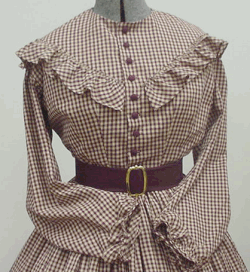 The corsage (body) is the often seen V style and buttons down the front using our re-production 1851 Goodyear's patent hard rubber buttons, (Available only at Blockade Runner).