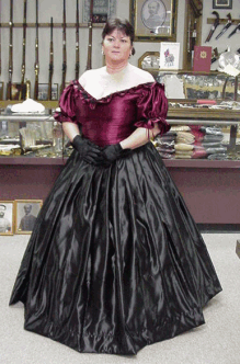 Connie is wearing a lovely one piece Ball Gown with a maroon top that is cut